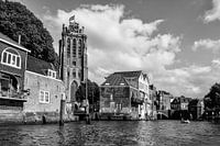 Een historisch stadsgezicht in Dordrecht, gezien vanaf het water. Langs de rivier zijn oude huizen te zien, die met hun gevels grenzen aan het water. De toren van de Grote Kerk met daarop de Dordtse vlag steekt daar bovenuit.