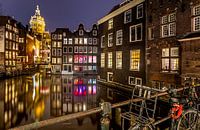 Amsterdam zicht op het water in de nacht met op de voorgrond een fiet en brug reling