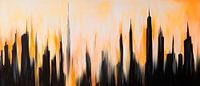 De silhouetten van majestueuze wolkenkrabbers steken krachtig af tegen een warme, stralende zonsondergang. De dynamische, glinsterende kleuren creëren een levendige energie die de kamer vult met stedelijke flair. Dit kunstwerk is perfect voor de woonkamer om de geest van de grote stad te vangen en inspirerende gesprekken op gang te…