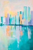 Een fascinerend samenspel van zachte pastelkleuren ontvouwt zich in dit abstracte stadsgezicht, dat de magie van stedelijke schoonheid combineert met een vleugje dromerigheid. De glinsterende reflecties in het water geven de kamer een ontspannen sfeer, ideaal voor een stijlvolle woonkamer die rust en inspiratie uitstraalt.