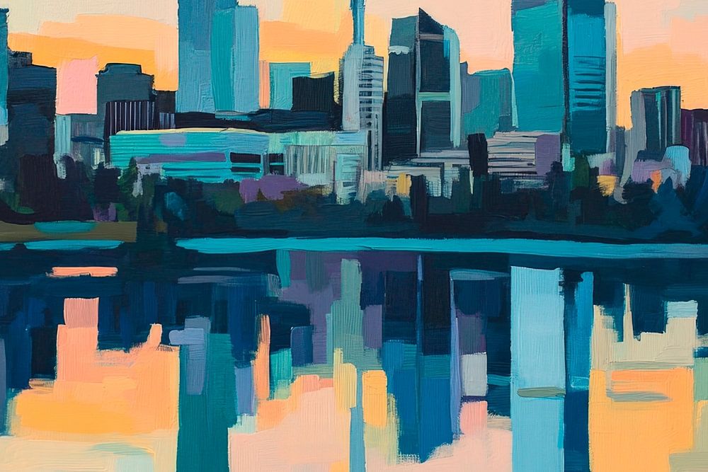 Een levendig, kleurrijk stadspanorama dat de skyline vastlegt in zachte pasteltinten. De reflecterende golven vormen een speels contrast met de opvallende torens en iconische torenspits. Ideaal voor de woonkamer, het verspreidt een ontspannen, creatieve sfeer en nodigt uit tot dromerige gedachten over stedelijke avonturen.