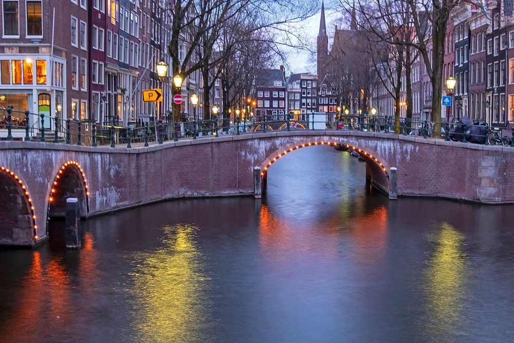 Stadsgezicht van Amsterdam in Nederland bij avond in Nederland