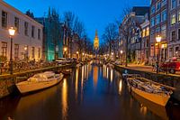 Stadsgezicht van Amsterdam met de Zuiderkerk bij zonsondergang in Nederland