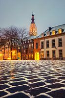 Beeld van centrum van Breda in de sneeuw (16 Januari 2021). Op de achtergrond is de Grote Kerk van Breda te zien (ookwel Onze-Lieve_Vrouwe kerk genoemd).