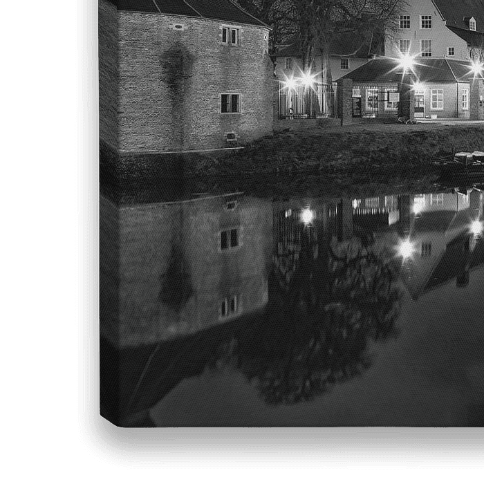 Avondopname in Breda, met de grote kerk als middelpunt, omgeven door een dramatische wolkenpartij in zwart-wit. De historische panden aan de rand van het centrum worden weerspiegeld in het water.