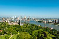 Een overzicht van de stad Rotterdam vanaf de Euromast met de Erasmusbrug centraal in beeld.