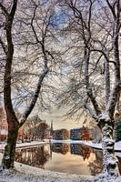 De stadsgracht van Leeuwarden ter hoogte van restaurant De Koperen Tuin met de Bonifatiuskerk op de achtergrond in een winters aandoend tafereel