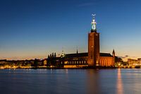 Stadhuis in Stockholm tijdens blauwe uurtje. Avond met strakblauwe lucht en lichtspiegelingen in het water