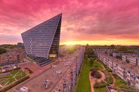 Het futuristische Stadskantoor van de Gemeente Den Haag (ook wel het tweede Stadhuis genoemd) te midden van jaren vijftig appartementsgebouwen in de wijk Morgenstond tijdens een prachtige zonsondergang