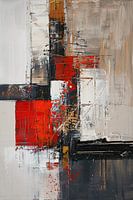 Stadskunst - Dit abstract schilderij kenmerkt zich door een dynamische compositie van overwegend neutrale tinten onderbroken door een krachtig rood vlak en omlijst door gedetailleerde texturen en vlakken in zwart en wit.