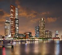 Stadslandschap Kop van Zuid Rotterdam met wolkenkrabbers van Montevideo en New Orleans weerspiegeld in een kanaal tijdens zonsondergang