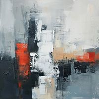 Stadsleven | Fiery Silence Break - Dit abstracte schilderij kenmerkt zich door een levendig contrast tussen vurig rood en koele blauwgrijze tinten, met een dynamiek van overlappende rechthoekige en onregelmatige vormen die een gevoel van diepte en beweging creëren.