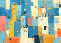 Stadsleven Schilderij | Colorful Life Squares - Dit stadsleven schilderij portretteert een levendig mozaïek van menselijke figuren en architectonische blokken in een dynamische, abstracte stijl met een kleurrijk palet van vooral blauw en geel.