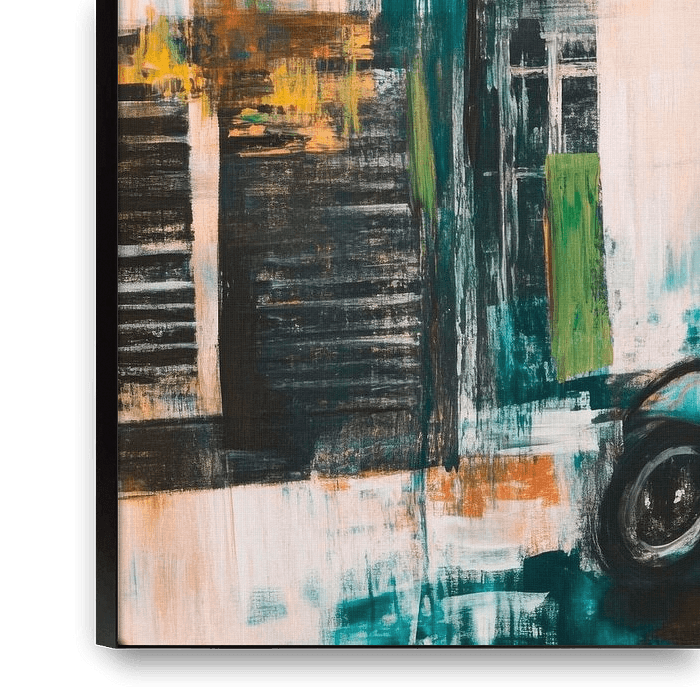 Een stedelijk mozaïek ontvouwt zich in zachte groene tinten en warme aardse kleuren. Luiken die verhalen fluisteren staan in contrast met de stijlvolle scooter die wacht op avontuur. De dynamische penseelstreken vangen het pulserende ritme van de stad en nodigen de kijker uit om op te gaan in deze levendige sfeer.