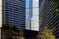 Ik vind het centrum van grote steden fascinerend, vooral als er veel wolkenkrabbers zijn met glazen panelen die de gebouwen eromheen weerspiegelen. Gecombineerd met hoogspanningsleidingen zijn er hier in de stad San Francisco, Californië, VS, een paar hele mooie stadslijnen ontstaan.