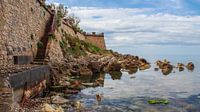 Een oude stadsmuur in Alghero (Sardinië, Italië) net na een regenbui. Door het heldere water van de Middelandse Zee zijn ook de rotsen onder water goed te zien.