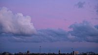 Zachte pastelwolken verspreiden zich over de avondlucht, terwijl de verre stadslijn zich rustig langs de horizon uitstrekt. Het contrast tussen de uitgestrekte lucht en de lage stad creëert een kalme en dromerige sfeer.