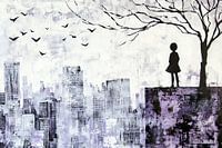 Stadssilhouet | Meisje Op Podium Stedelijke Skyline - Dit abstracte stedelijke schilderij toont een silhouet van een jong meisje op een podium met op de achtergrond een metropool en vliegende vogels, overwegend in zwart, wit en grijs met subtiele paarse tinten.