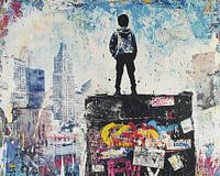 Stadssilhouet | Stadssilhouet - Dit is een urban kunst schilderij met een jongen die uitkijkt over een chaotische stadsgezicht, omhuld in levendige kleuren en dynamische texturen die de energie en onrust van de stedelijke omgeving uitbeelden.