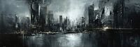 Stadsskyline | Urban Reflections - Dit stedelijke schilderij toont een geabstraheerde, industriële skyline, met dominante grijze en zwarte tinten, doorspekt met schitteringen van licht die reflecteren op een vochtig oppervlak.