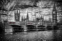 Het Palace of Westminster ligt in de stad Westminster direct aan de Theems in het hart van Londen. Dit stadswerk toont twee van de typische rode bussen op Westminster Bridge. Decoratief en modern motief met het silhouet van het beroemde stadsgezicht.