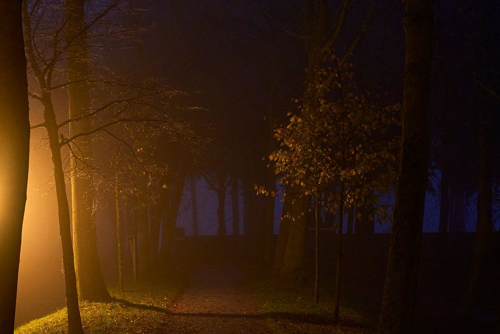De stadswal van de Gelderse stad Elburg wordt in de nacht verlicht door een klassieke straatlantaarn.