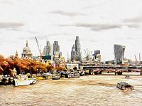 Fotokunst gebaseerd op een foto die ik nam vanaf Waterloo Bridge over de Theems naar Blackfriars Bridge in het oosten. Links is de Embankment die leidt naar de City of London en de wijk East London. Het beeld omvat onder meer de koepel van St Pauls Cathedral en de prachtige Heron Tower, The Gherkin, The Cheese Grater en The Walkie Talkie. Linksonder liggen een aantal boten afgemeerd aan de Embankment, en een aantal passagiersvoertuigen die over de Theems varen.