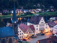 Een impressie uit Saksisch Zwitserland: Een uitzicht vanaf de kasteelheuvel van de stad Wehlen over de markt en de Elbe.