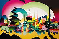 Auf dem Bild wird eine atemberaubende Darstellung einer japanischen Stadtlandschaft gezeigt. Die Farben und Muster auf dem Gemälde explodieren förmlich vor lebendiger Energie und schaffen ein fesselndes visuelles Erlebnis.