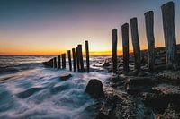 Op een heldere avond die kleurrijk afsloot stijgt het water langs de dijk van Westkapelle. De golfbrekers ontstijgen voorlopig nog het water. September 2018.