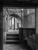 Trappen naar een lager gelegen deel van het kasteel Stirling Castle. De poort geeft een doorkijkje naar de grote binnenplaats. Op het muurtje naast de trap is hekwerk geplaatst.
