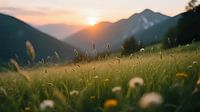 De foto toont een intieme macro-opname van een wilde grasspriet in de bergen bij zonsondergang en legt een vluchtig moment van stilte en warmte vast. Een enkele grasspriet staat op de voorgrond, de fijne haarstructuren en kleine dauwdruppels zijn duidelijk zichtbaar, hoewel de kleine scherptediepte de omgeving verandert in zacht bokeh.…