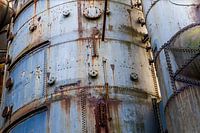 Over de grijsblauwe wanden druipen roestbruine stalen tranen omlaag. Als een metalen wachter bewaakt de ronde constructie zijn omgeving.