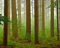 Stammen in een heerlijk geurend bos op de vroege morgen... Het fijne zachte licht schijnt er tussendoor. Heerlijk toch...? U hoeft de deur niet meer uit...