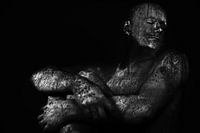 Houten standbeeld van een naakte zittende man. Foto met veel contrast.