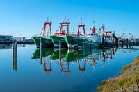 Standby Safety Vessel-schepen "Jan van Gent", "Linda-C" en "Octopus" in de haven van Lauwersoog. Windstil dus een perfecte spiegel in het water. Strak blauwe lucht.
