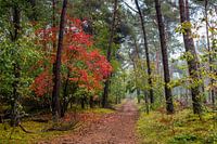 Standing Out In Red in the green pine forest on a misty autumn morning at nature reserve 'Boshuizerbergen' (Venray, Netherlands).