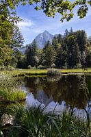Prachtig uitzicht op de berg Stanserhorn weerspiegeld in het stille water van het meer Gerzensee, in Obwalden in Zwitserland. Een zomeruitzicht met groene bomen in een prachtig landschap in de Zwitserse Alpen.