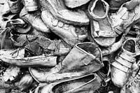 De sokkel van het kunstwerk Levensloop in de Groningse woonwijk Selwerd is gemaakt uit een grote verzameling zeer diverse schoenen en laarzen van de inwoners van deze woonwijk. Het kunstwerk ligt langs de route van de etappe Winsum naar 050 Groningen van het Pieterpad. Deze foto is gemaakt in het voorjaar van 2018. Uitvoering in Zwart-Wit