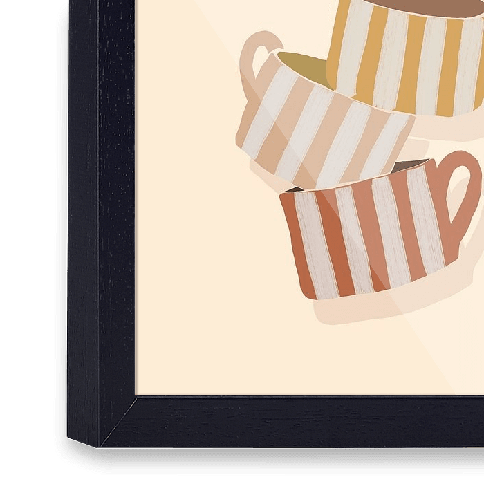 Een vrolijke ode aan koffie en theemomenten in kleur! Zes gestreepte koffiekopjes en theekopjes– in olijfgroen, saliegroen, oudroze, okergeel, lichtroze en terra – balanceren speels op elkaar. De zachtroze achtergrond maakt het geheel licht en uitnodigend. Deze illustratie brengt een glimlach op je gezicht en is perfect voor elke…
