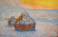 De monumentale stapels die Claude Monet in zijn serie Stacks of Wheat afbeeldde in zijn serie Stacks of Wheat rezen vijftien tot twintig voet op en stonden net buiten de boerderij van de kunstenaar in Giverny. Tot 1890 en 1891 werkte hij aan deze serie zowel op het terrein, waar hij tegelijkertijd op meerdere ezels schilderde, als in het atelier, waar hij de picturale harmonieën verfijnde. In mei 1891 hing Monet vijftien van deze doeken naast elkaar in een klein kamertje in de Galerie Durand-Ruel in Parijs. De tentoonstelling was een ongekend kritisch en financieel succes en betekende een doorbraak in Monet's carrière en in de geschiedenis van de Franse kunst. In deze visie, en in bijna alle herfstgezichten in de serie, doorbreken de kegelvormige toppen van de stapels de horizon en duwen ze de lucht in. Maar in de meeste winterse uitzichten, die de kern van de serie vormen, lijken de stapels te worden ingepakt door stroken van heuvel en veld, alsof ze voor het seizoen zijn ingepakt. Voor Monet was de stapel een resonant symbool van levensonderhoud en overleving. Hij volgde deze groep met verdere series met populieren, de gevel van de kathedraal van Rouen en later zijn eigen tuin in Giverny. Het Art Institute heeft de grootste groep van Monet's Stacks of Wheat in de wereld.