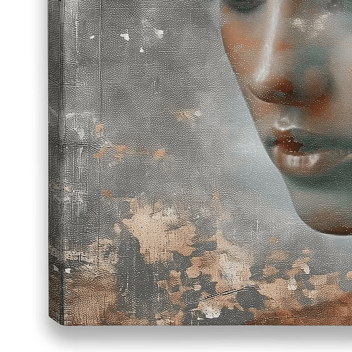 Etherisch portret van een jonge vrouw, waarbij haar gelaat versmelt met een kosmische achtergrond van sterren en nevelachtige vormen. De textuur lijkt te hinten op verval of ouderdom, wat de afbeelding een historische sensatie kan geven, terwijl de sterren een tijdloosheid en verbinding met het universum suggereren.