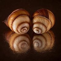 "Starend naar de reflectie: twee spiraalschelpen kijkend naar eigen reflecties" is een macrofoto van twee prachtige spiraalschelpen/ spiraalslakkenhuisjes. Dit soort schelp/slakkenhuisje heet: " Phoenicobius Aratus".