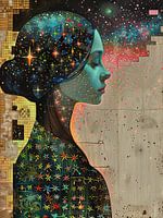 Stargazer Silhouette - Dit vrouwen schilderij illustreert een surrealistisch portret van een vrouw met een kosmisch motief in haar haar en jas, welke opvallende sterren, planeten en nevels toont tegen een achtergrond van geometrische patronen.