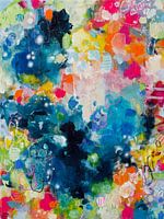 Waan je tussen de sterren, in een ruimtenevel vol prachtige kleuren. Of blijf je liever met beide benen op de grond en droom je bij dit werk over een uitbundige tuin met lonkende bloemen? Gebruik je fantasie en neem een momentje om te ontsnappen met dit speelse abstracte beeld.