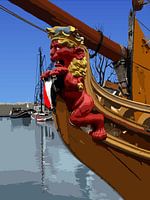 Het digitale kunstwerk toont een indrukwekkend detail van het statenjacht De Utrecht, een historisch zeilschip dat ooit symbool stond voor de macht en waardigheid van de provincie Utrecht. Centraal in de compositie prijkt de gebeeldhouwde boegbeeld-leeuw, krachtig en majestueus, met zijn kop fier geheven. Zijn manen zijn met gouden…