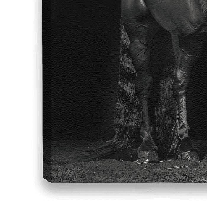 Dit beeld toont een majestueuze Fries paard tegen een donkere achtergrond. De gespierde bouw van het paard wordt benadrukt door de zorgvuldige belichting die glinstert op zijn gepolijste, zwarte vacht en de lange, krullende manen en staart. De details en het spel van licht en schaduw brengen de krachtige, doch elegante kenmerken van dit…