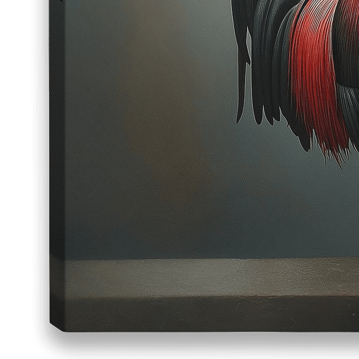 Een statige haan staat trots rechtop, zijn borst vooruit en zijn kop hoog geheven. Zijn veren zijn weergegeven in intense, levendige kleuren, met name een diep, vurig rood dat de kam en lellen accentueert.