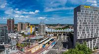 Panorama gemaakt vanaf een uniek punt in Rotterdam. De panorama is van het 'blaak-gebied'. Op de foto is een stukje van de markthal te zien, de potlood, kubus woningen en de centrale bibliotheek Rotterdam.