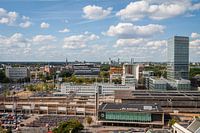 Station Eindhoven, tegenwoordig Eindhoven Centraal, van bovenaf gezien. Op de achtergrond is Woensel te zien. In de toekomst zal dit beeld veel veranderen, er komt veel hoogbouw bij.